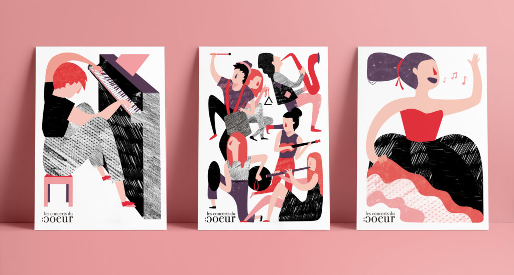 À partir de 2017, j’ai collaboré avec la graphiste Malaika Schürch dans le cadre de la l’univers visuel et des illustrations pour Les concerts du coeurr, une association active dans plusieurs cantons suisses et engagée dans l’organisation de concerts caritatifs.